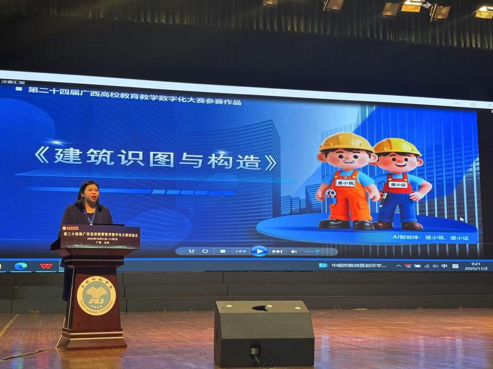 11月2日,在玉林举行的第二十四届广西高校教育教学数字化大赛决赛中,由我校王宇平老师主持的参赛作品:AI融合数字化课程《建筑识图与构造》,在高职理工课程组的18支决赛队伍中表现卓越,以排名第一的优异成绩荣获一等奖。