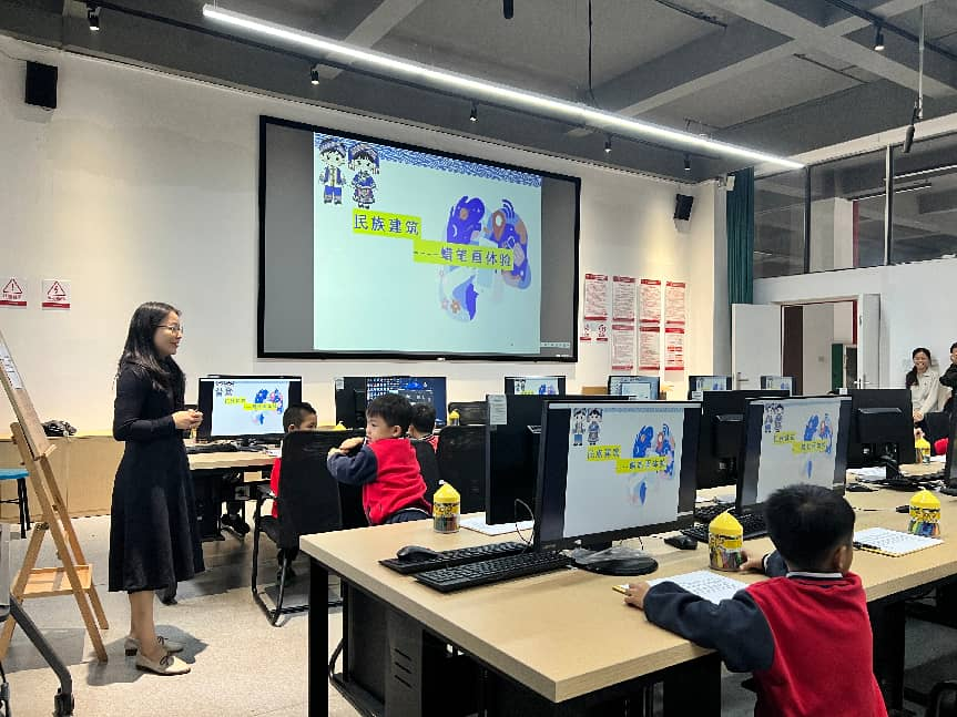 在虚拟仿真实训基地,李群老师引导孩子们用艺术的眼光重新审视建筑。孩子们以蜡笔为工具,将刚刚参观过的民族建筑元素,如翘角飞檐、雕花窗棂、层叠的屋顶,化作一幅幅充满童真与想象的画作。这一过程激发了孩子们的艺术创造力,也加深了对建筑美学形式的理解。