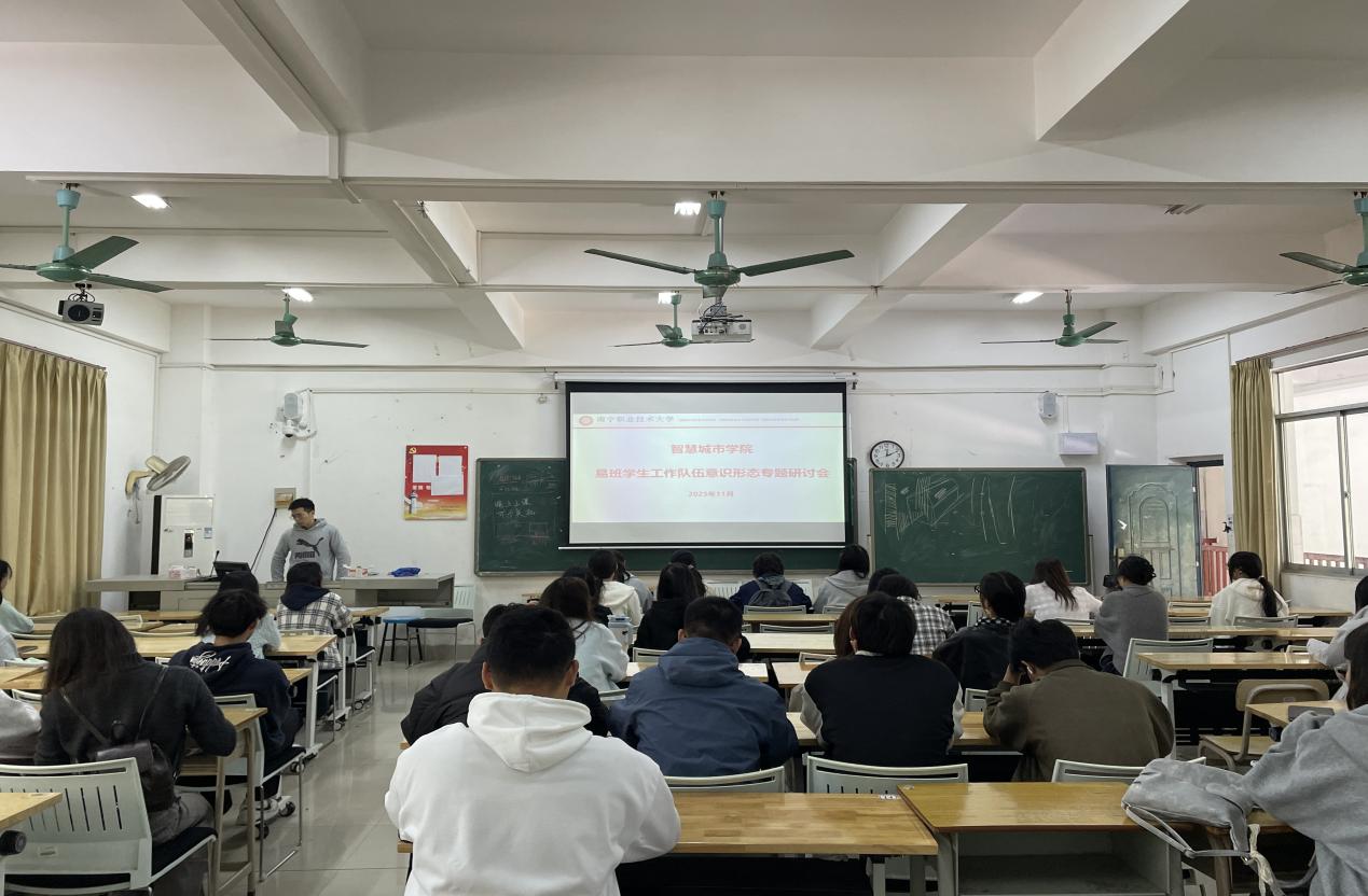 为更好开展易班管理工作,11月21日中午,智慧城市学院在C206教室召开易班学生工作队伍意识形态专题研讨会。研讨会由辅导员阮冠辉老师主持,2024级和2025级全体易班班长参加。