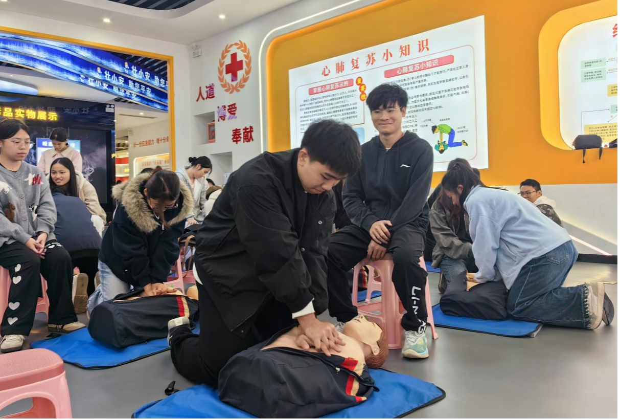 同学们在模拟心肺复苏救援场景(黄燕/摄)