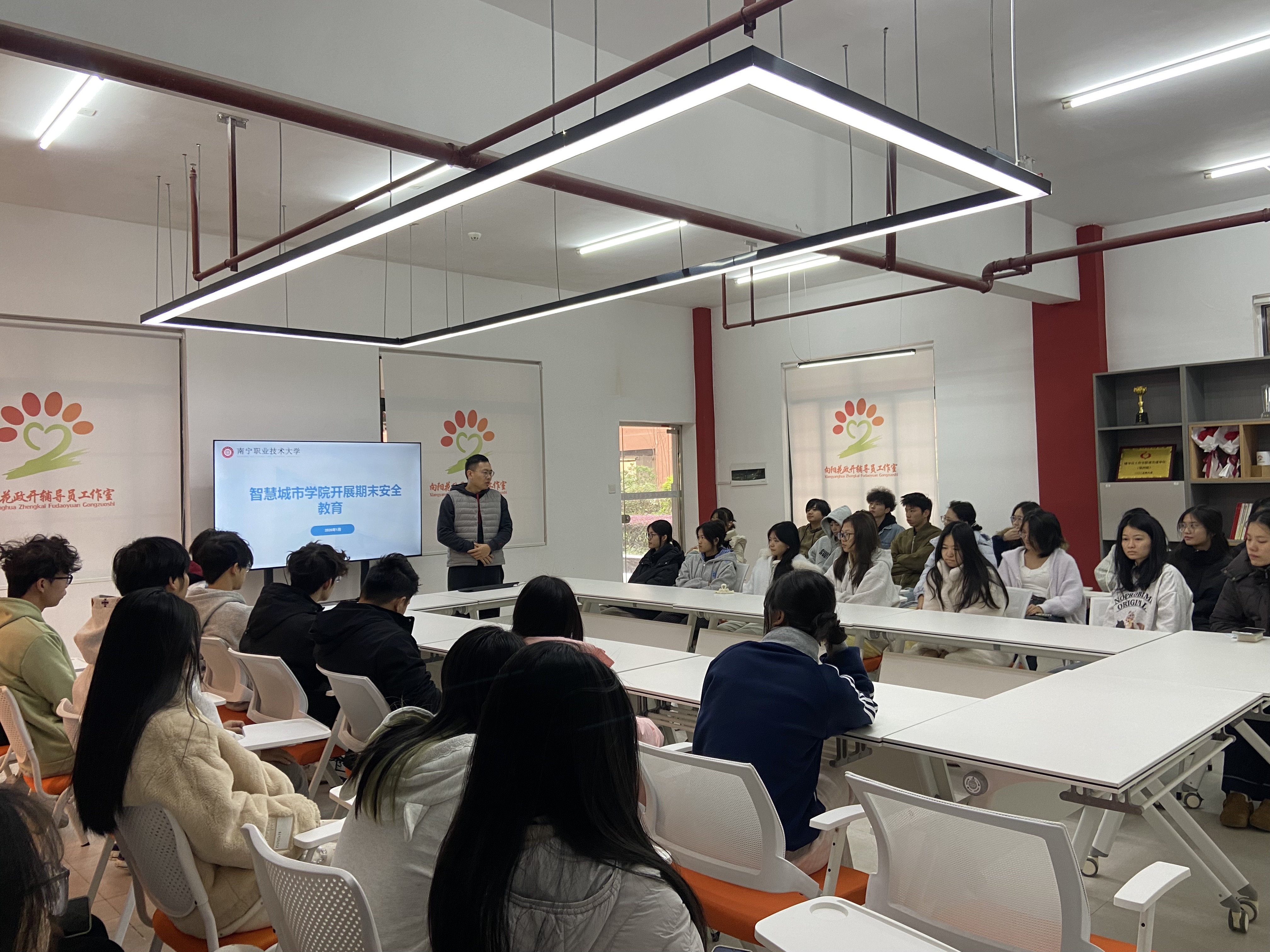 为进一步增强学生安全防范意识,确保期末及寒假期间校园安全稳定,1月8日,智慧城市学院在19栋“向阳花政开”辅导员工作室组织开展了期末安全教育主题活动。活动由学院辅导员曾顺主讲,各年级班级学生代表共计40余人积极参与。