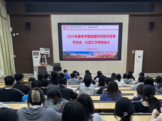 为进一步强化对共青团工作的指导,明确新学期学生会、社团工作方向,凝聚青年力量推动各项工作发展,3月16 日下午,智慧城市学院在第三教学楼第四阶梯教室召开2026年春季学期团委研究联系指导学生会、社团工作专题会议。学院团委书记黄吉、团委副书记黄燕,团委指导老师麻华仁、韦梅真出席会议,全体团委、学生会全体委员及各学生社团负责人参加会议。