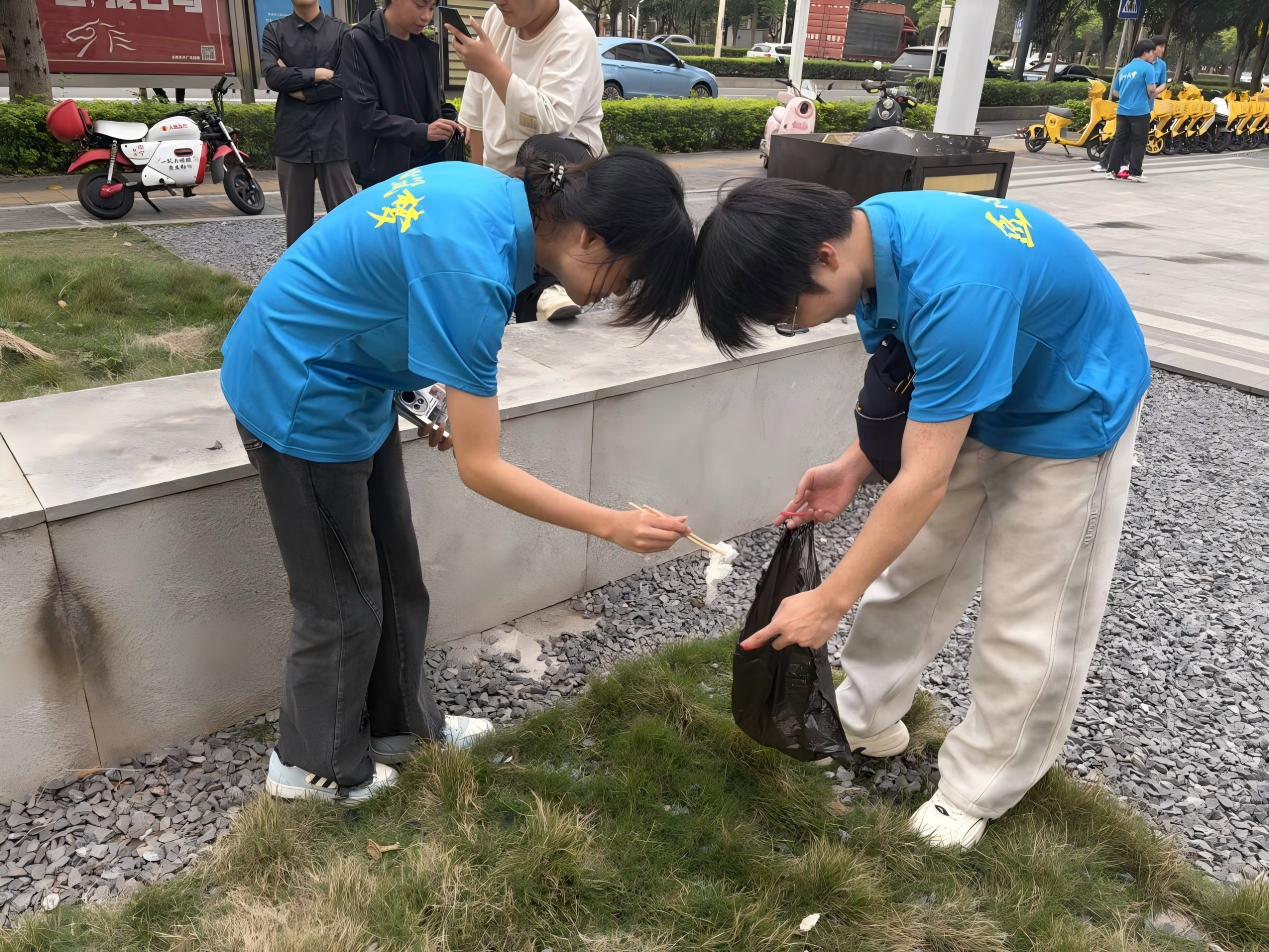 活动伊始,同学们身着统一志愿服装,手持垃圾袋、扫帚、垃圾铲、筷子等工具,迅速分组投入劳动。大家两两协作,深入社区绿化带、人行道及草坪区域,细致捡拾烟头、纸屑、塑料瓶等各类垃圾,不放过任何一处卫生死角。与此同时,另一组同学主动将乱停乱放的共享电动车搬运至指定区域,并引导居民有序停放。经过一个半小时的默契配合,社区环境面貌焕然一新:广场地面整洁干净,车辆排列整齐有序,整体公共空间得到显著改善。