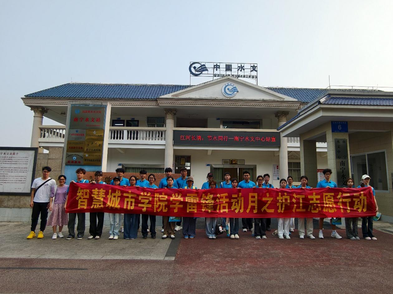 紧接着,志愿服务团队一行前往“百里秀美邕江”——水利部2024年幸福河湖优秀案例现场,徒步观察邕江生态景观与滨水公共空间设计,结合专业重点关注了滨水空间的景观营造、建筑风貌与环境融合等内容,为专业学习积累了实践素材。随后,团队沿江进行护江行动,在工作人员的指引下清洁江边卫生并参观了南宁水文站,了解水文监测设备、数据采集流程及水文工作在防洪减灾、水资源管理中的核心价值,进一步认识到水利工程的基础支撑作用。